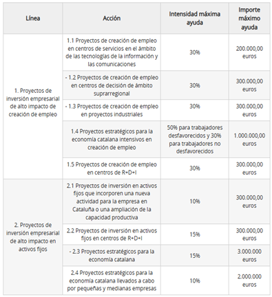 - Acción 2.4: Proyectos estratégicos para la economía catalana llevados a cabo por pequeñas y medianas empresas que supongan la implantación de nuevas empresas en Cataluña, la apertura de nuevos emplazamientos de las empresas ya presentes o una ampliación y/o diversificación de la actividad de emplazamientos ya existentes. El gasto mínimo aceptado en activos fijos productivos debe ser de 3.000.000 de euros y se requiere la creación neta de, como mínimo, 5 puestos de trabajo directos