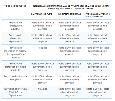 - Las intensidades de ayuda máximas y según los tipos de proyectos y beneficiarios, serán las siguientes: