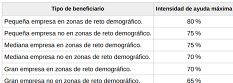 Intensidad de máxima de ayuda en función del tipo de empresa (pequeña, mediana, grande) y de la zona donde se ubique el proyecto