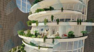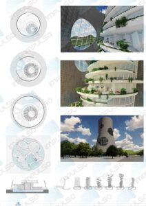 El viejo cascarón de hormigón se rellena con un nuevo edificio de usos mixtos, que alberga un complejo de oficinas y un hotel únicos. Las acciones del viento sobre la estructura son absorbidas por la torre, que libera de este modo al nuevo edificio de importantes cargas, con el consiguiente ahorro en su estructura portante. Al mismo tiempo, la cáscara de hormigón elimina las ganancias térmicas por radiación, optimizando el comportamiento energético del conjunto.