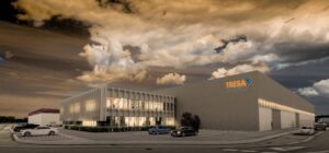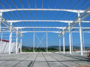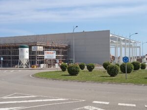 Nave Industrial. La nave se plantea como un volumen sobrio en el que, respondiendo a las necesidades funcionales de la propia operativa industrial, no reste calidad formal a las fachadas. En las fachadas norte, este y sur (aquellas en las que no están adosadas las oficinas) se plantean tres franjas horizontales, cada una con un material: panel de hormigón, franja de material traslúcido (policarbonato) y panel sándwich. La altura de cada material viene determinada por la altura que tienen los portones de acceso a la nave que, a su vez, responden a las necesidades operativas de la actividad industrial a desarrollar en el interior.