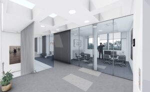 La cubierta de las oficinas es plana y en ella se situarán las máquinas necesarias para climatización y los lucernarios que aportan luz natural a la planta superior y vestíbulo de entrada de la planta de acceso.