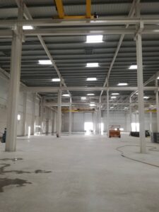 El interior de la nave no está compartimentado, es un espacio diáfano. La estructura de la nave no es homogénea en toda la planta: aproximadamente la mitad de la superficie tiene los pórticos en dirección norte-sur mientras que en la otra mitad los pórticos responden a la dirección este-oeste. Esta distribución de la estructura refleja las necesidades operativas internas de la empresa para optimizar el proceso de producción y almacenaje en combinación con los puntos de carga-descarga y los puentes grúas.
